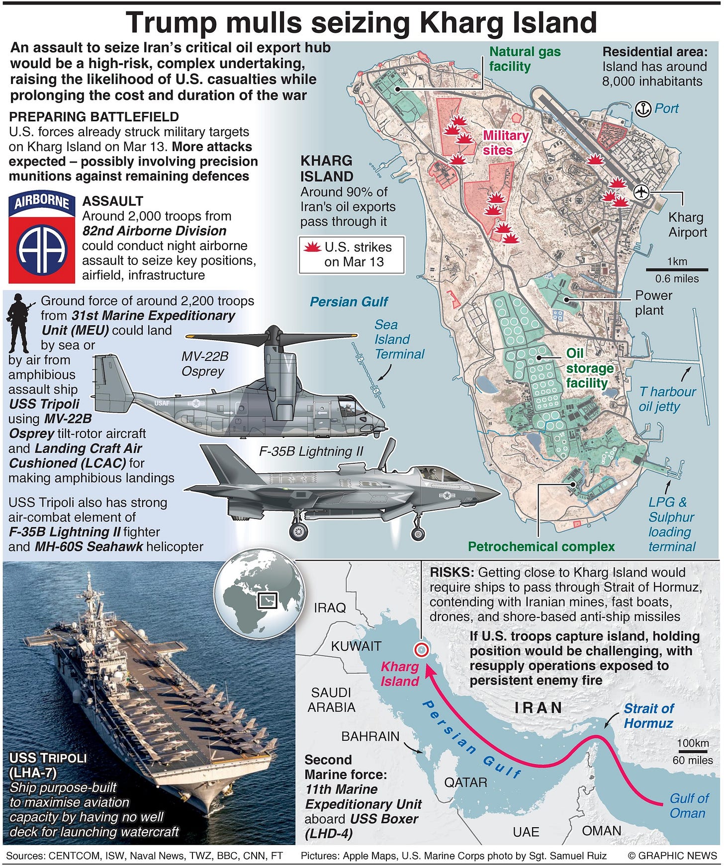 However, any assault would be complex. U.S. forces would face threats from Iranian mines, drones and missiles when approaching the island, and holding it would be difficult, with resupply operations exposed to sustained attack.